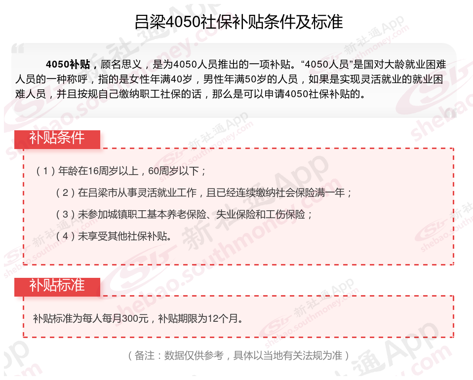 一、2025年吕梁灵活就业4050社保补贴标准和条件是什么