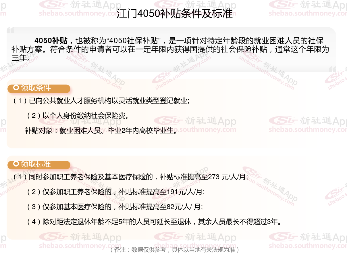 二、2025年江门4050社保补贴标准及条件,最新如下: