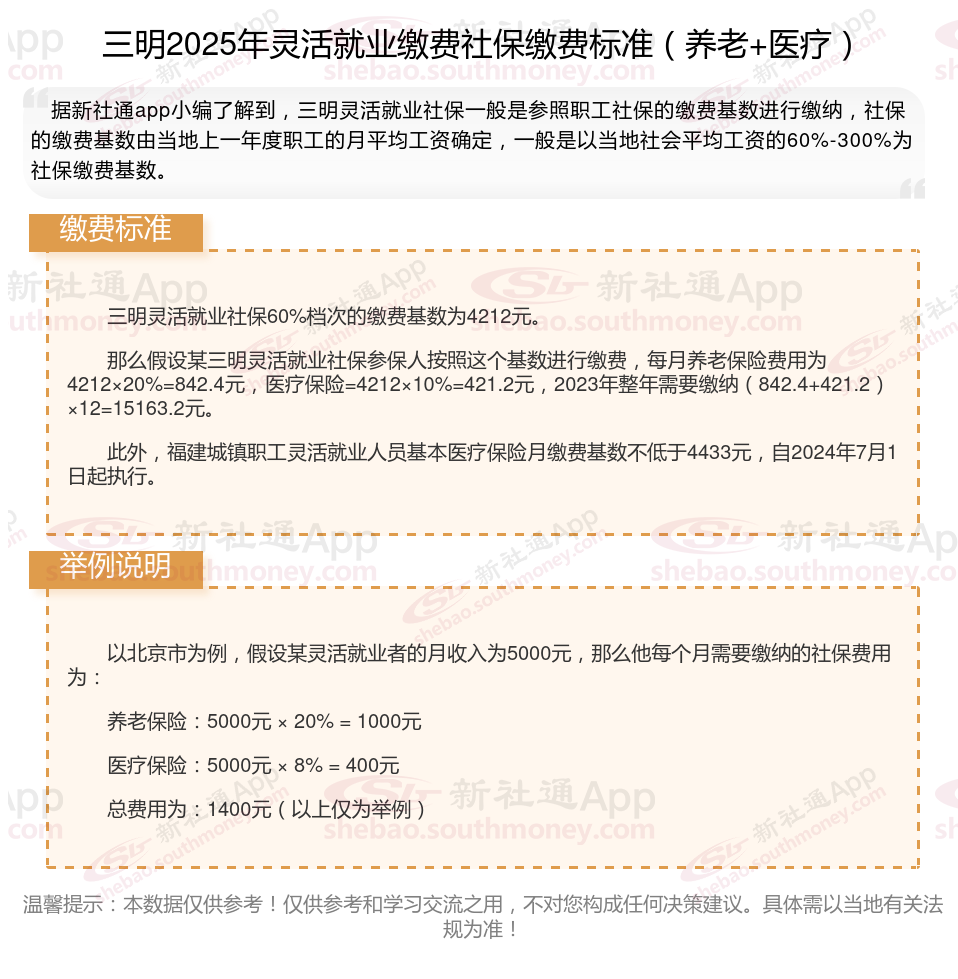 随着经济社会的不断发展,灵活就业群体不断地日益壮大,其社保缴费问题也愈发受到关注。那么2025年三明灵活就业人员社保交多少钱,你了解2025年三明灵活就业人员社保缴费基数及比例吗,接下来随新社通APP小编一起来看看。