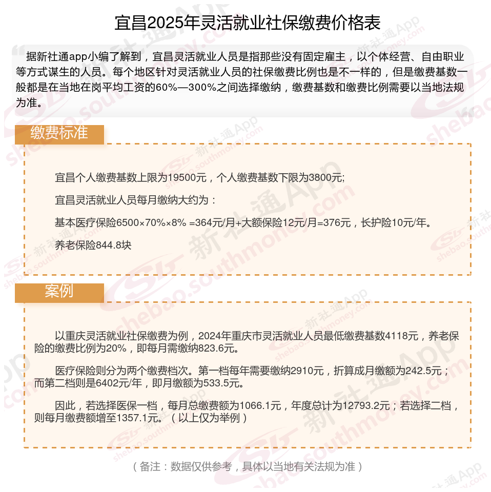 据新社通app数据显示,2024-2025年宜昌灵活就业人员养老保险的缴费标准: