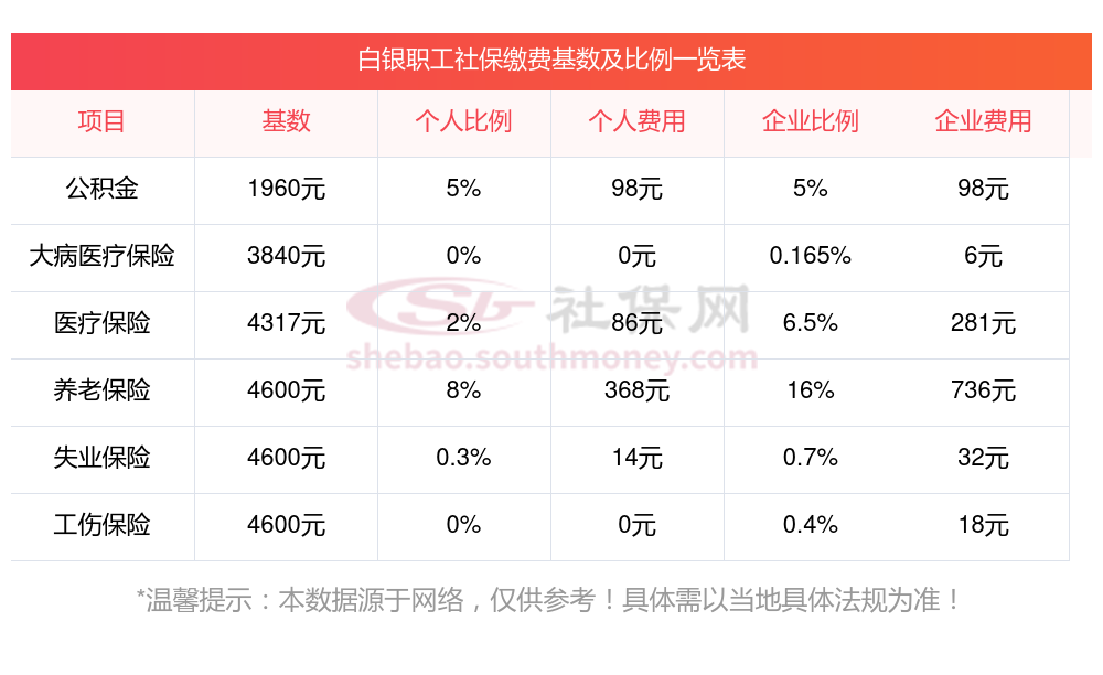 白银社保一个月交多少钱,个人缴纳多少钱一个月?下面和新社小编一起来看看白银最低标准社保费用明细参考,新社通app-社保缴费查询工具提供的最新数据如下: