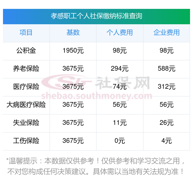 和新社通一起来了解下:孝感五险一金交多少钱一个月怎么算?2024-2025年孝感社保费用明细参考,新社通app-社保缴费查询工具提供的最新数据如下:
