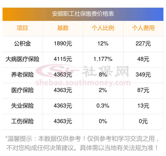 2025年安顺社保缴费多少钱?下表是2024-2025年安顺社保费用明细参考,新社通app-社保缴费查询工具提供的最新数据如下: