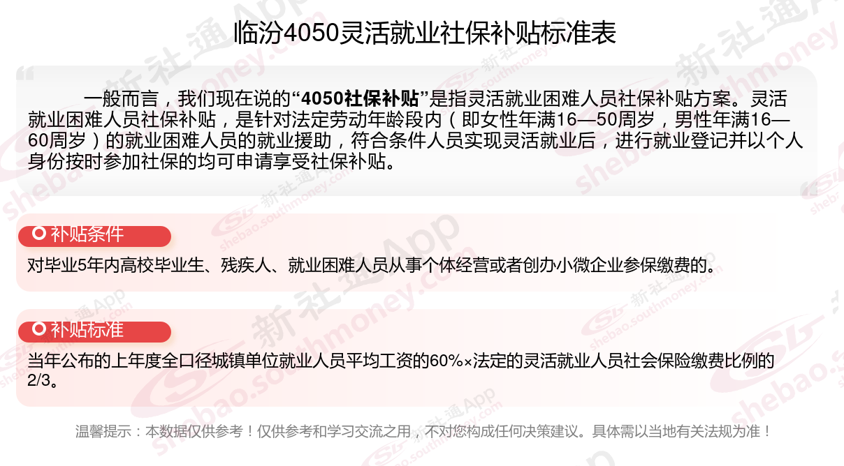 二、2025年临汾4050社保补贴标准(临汾4050灵活就业人员补贴标准是多少钱?临汾2025年4050补贴新规能领多少钱?)