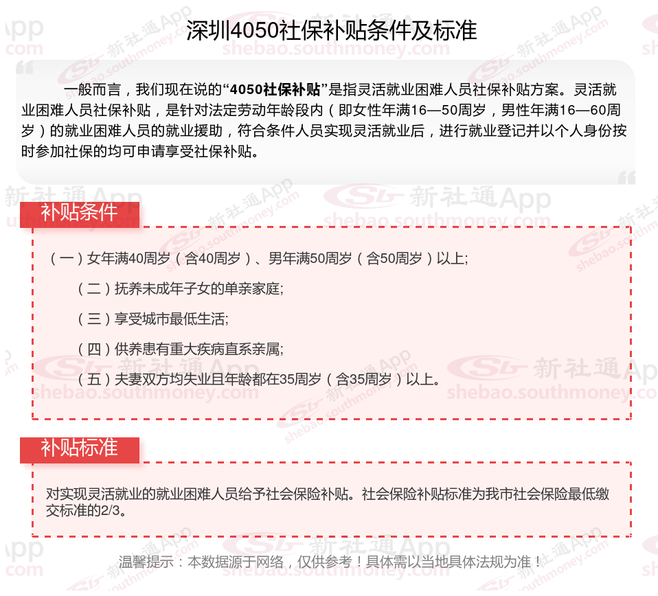 二、2025年深圳4050社保补贴标准及条件,最新如下: