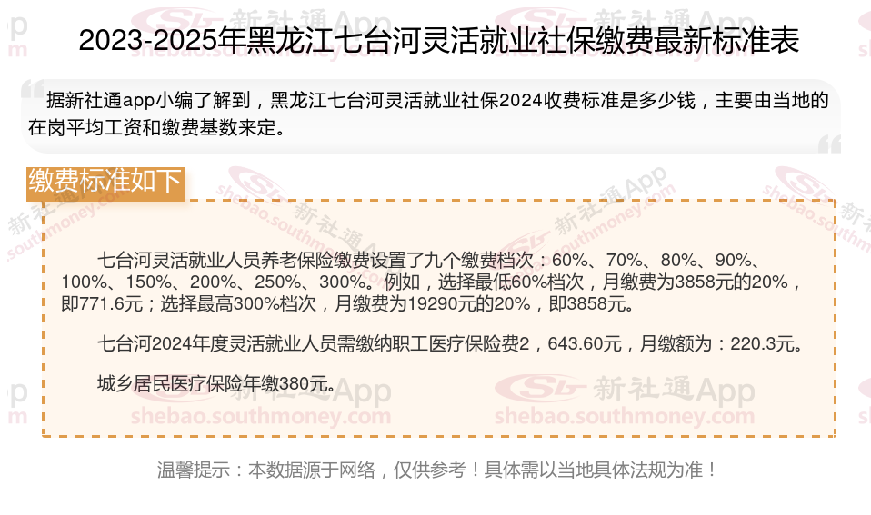 黑龙江七台河社保缴费多少钱?下表是2024-2025年黑龙江七台河社保费用明细参考,根据新社通app-社保缴费查询工具提供的最新数据如下: