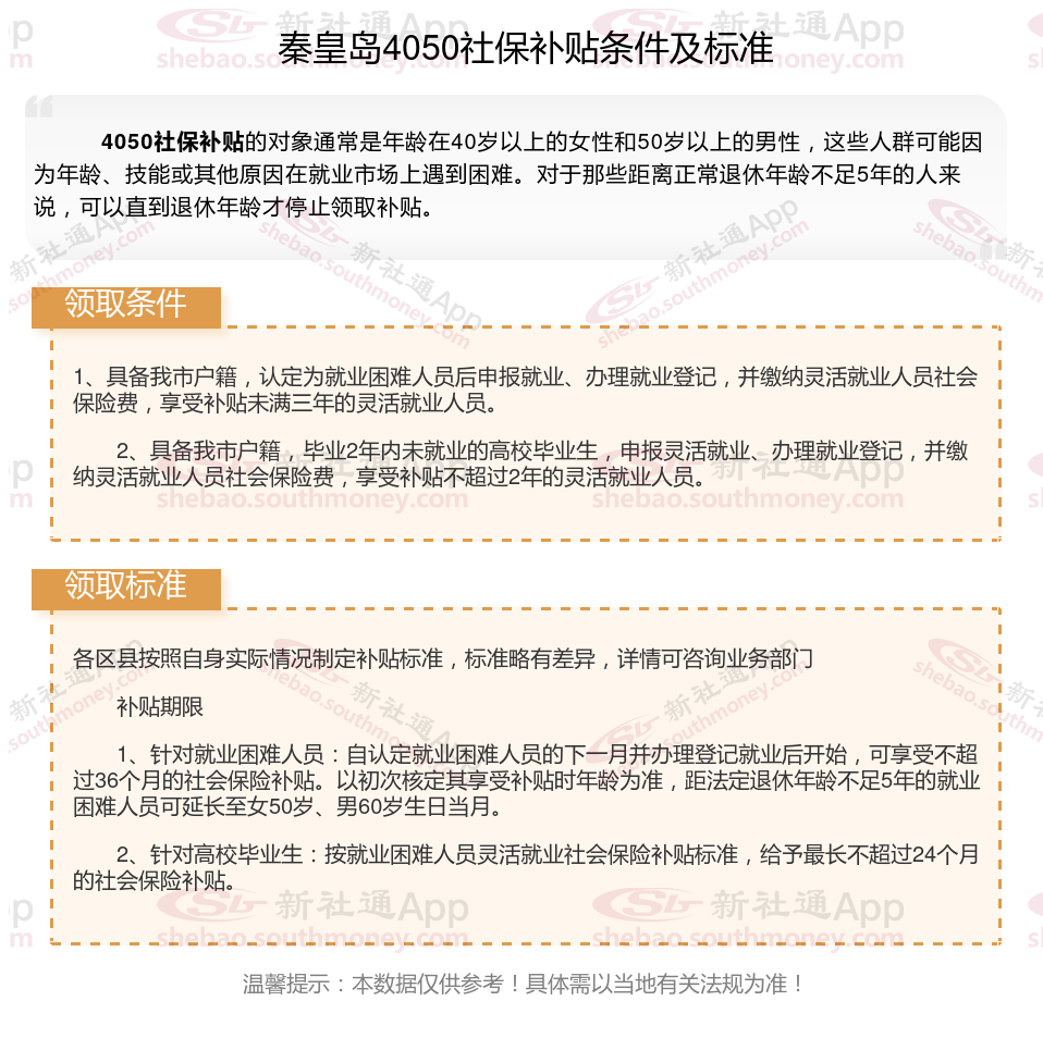 今天聊一下4050补贴的相关内容。4050补贴听起来像是一个针对特定年龄人群的社保补贴。比如女性需年满40周岁,男性需年满50周岁(以申请当年12月31日为截止日期)。那么秦皇岛4050灵活就业困难人员社保补贴多少钱?秦皇岛4050社保补贴可以申请吗?接下来随新社通APP小编具体了解一下4050社保补贴内容。
