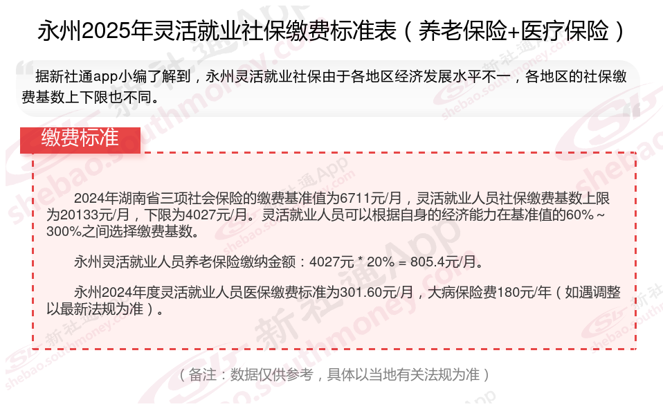 据新社通app数据显示,永州灵活就业养老保险的缴费基数为:4027元。灵活就业人员参保缴费的比例为个人20%。