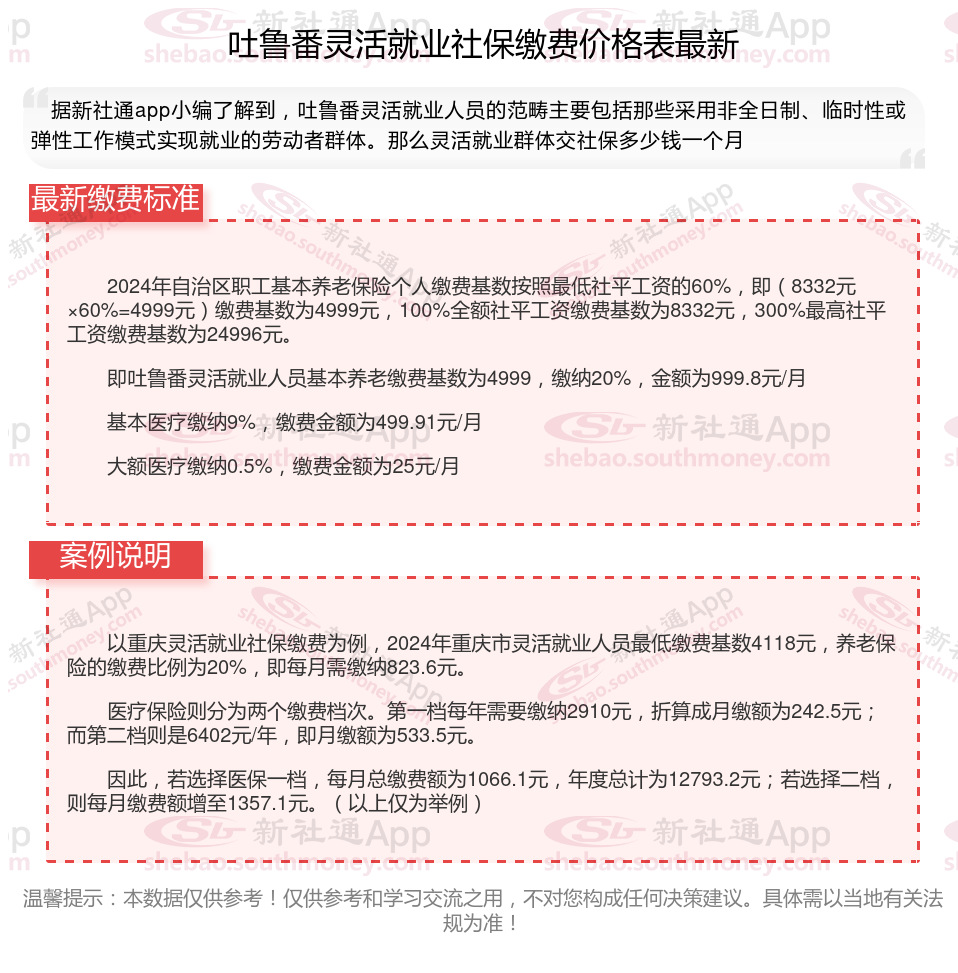 一、2024年吐鲁番灵活就业社保缴费标准表 吐鲁番灵活就业社保多少钱一个月?