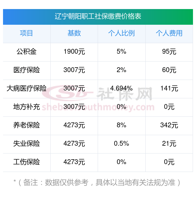 2025年辽宁朝阳社保缴费多少钱?下表是2024-2025年辽宁朝阳社保费用明细参考,新社通app-社保缴费查询工具提供的最新数据如下: