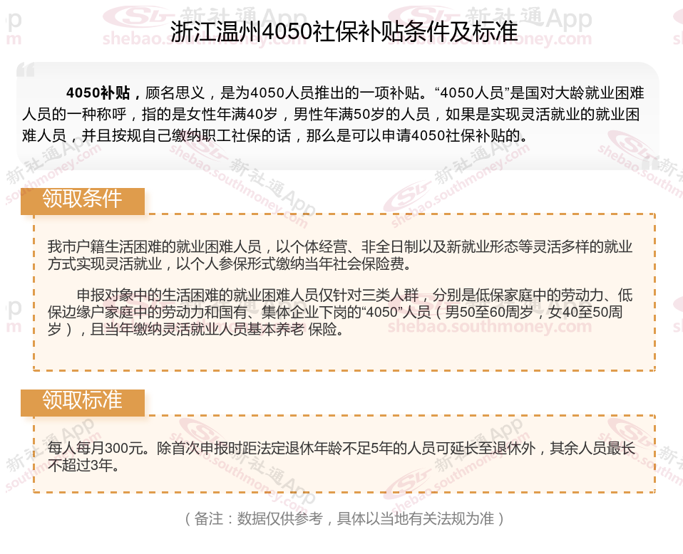 浙江温州4050灵活就业社保补贴标准如何?“4050补贴”主要是针对大龄就业困难人群的社保补贴,申请条件包括年龄、就业困难、灵活就业并自费缴纳社保,需要持有失业登记证,不同地区可能有细微差别,比如农村户口的限制。那么浙江温州4050灵活就业社保补贴标准是多少钱?浙江温州4050社保补贴条件是什么?接下来随新社通APP小编了解一下浙江温州4050灵活就业社保补贴标准最新资讯。