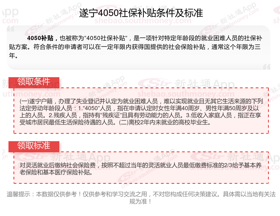 2025遂宁4050补贴主要针对的是年龄在40岁以上的女性和50岁以上的男性,这些人群通常因为年龄较大而面临就业困难。