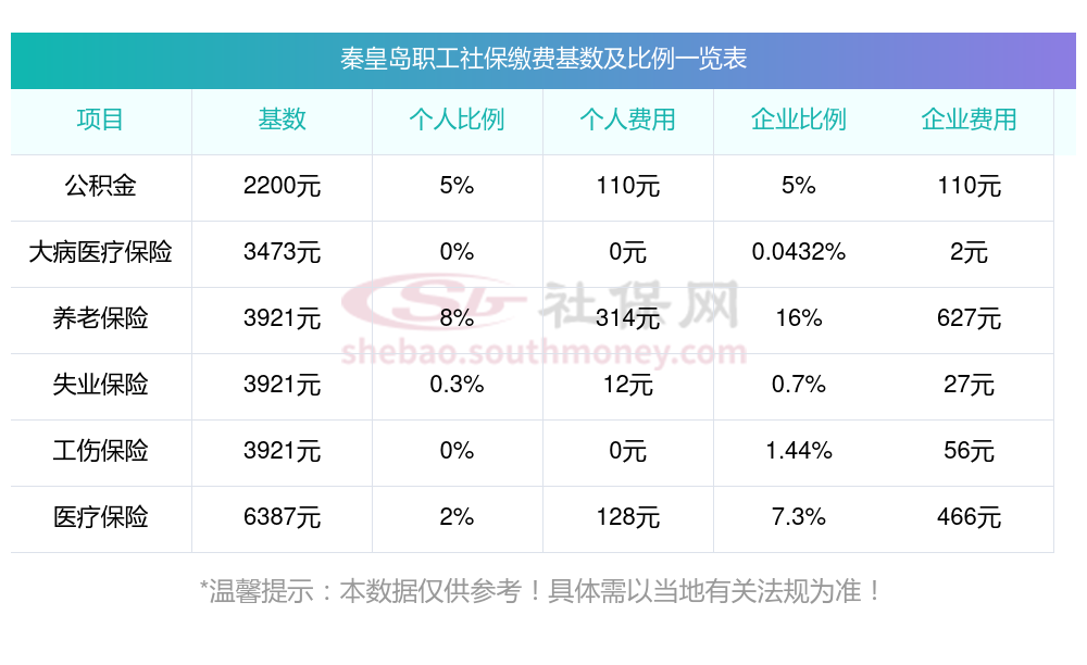 2025年秦皇岛社保缴费价格标准是多少,2025年秦皇岛社保缴费多少钱?下表是2025年秦皇岛社保费用明细参考,新社通app-社保缴费查询工具提供的最新数据如下: