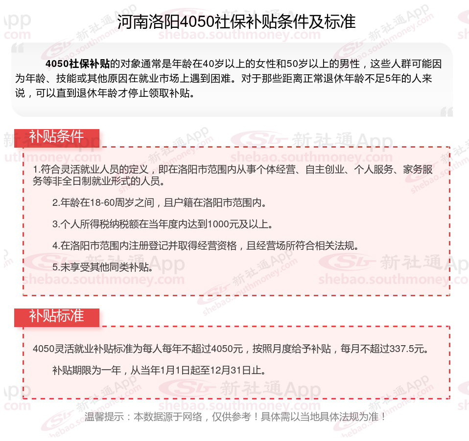 河南洛阳4050灵活就业社保补贴是什么?今天聊一下4050补贴话题。44050社保补贴标准据新社通app小编了解,通常,4050社保补贴包含基本医疗保险和基本养老保险两个险种,社保补贴金额为申请人实际缴纳基本养老保险和基本医疗保险金额的2/3,具体标准以当地社保局公布的数据为准!那么河南洛阳4050灵活就业社保补贴标准是多少钱?河南洛阳4050社保补贴可以领取多少?接下来随新社通APP小编了解一下河南洛阳4050灵活就业社保补贴的最新资讯。