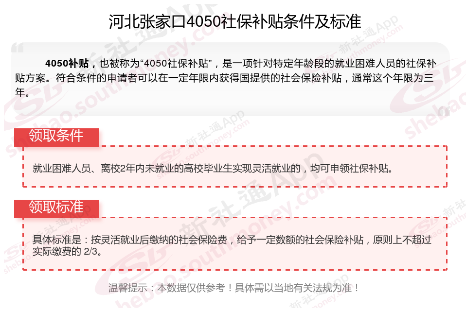 一、2023-2024年河北张家口4050社保补贴标准及条件
