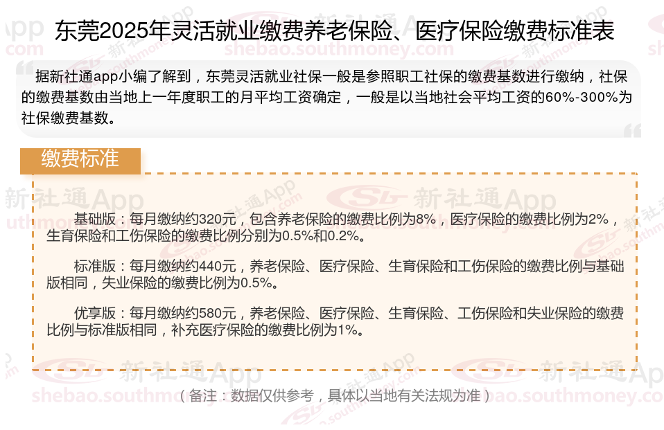 据新社通app数据显示,东莞灵活就业养老保险缴费基数2024-2025年最新标准如下: