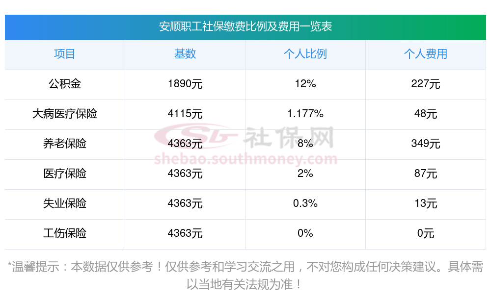 2025年社保多少钱一个月?下表是2024-2025年安顺社保费用明细参考,新社通app-社保缴费查询工具提供的最新数据如下:
