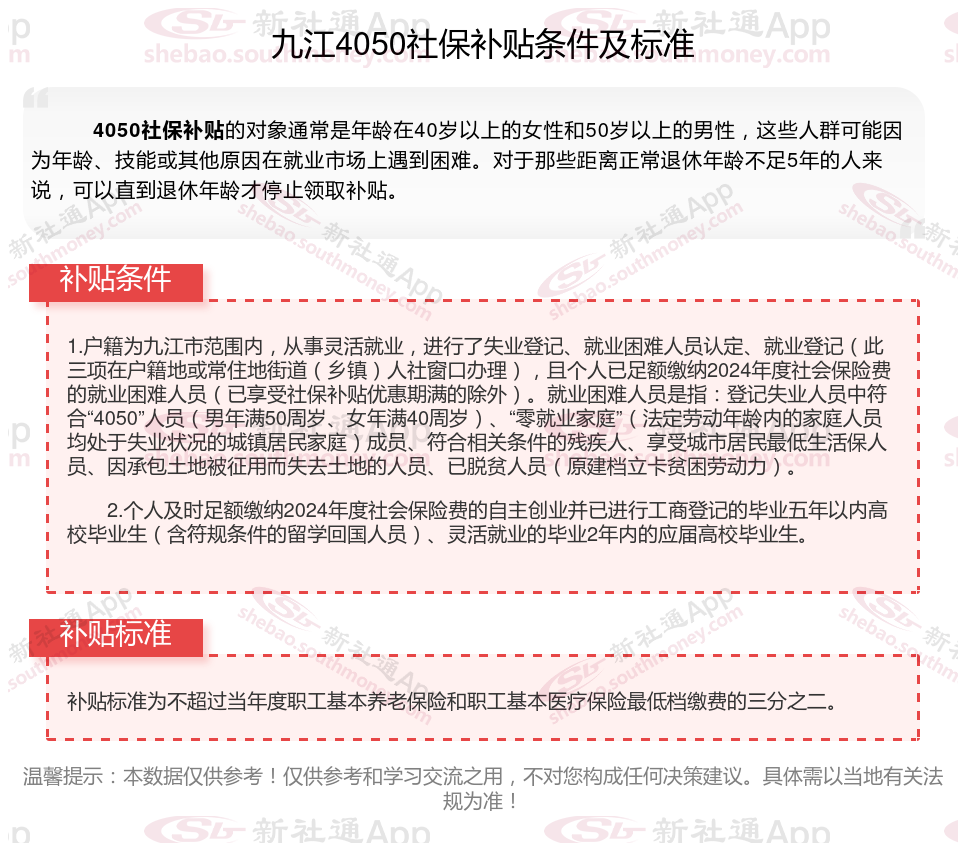 一、2023-2024年九江4050社保补贴标准及条件,最新如下