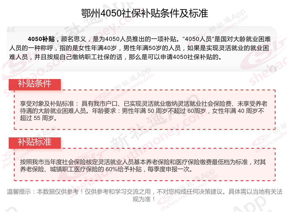 二、鄂州4050社保补贴多少钱一个月?鄂州4050社保补贴2025年最新标准是多少?