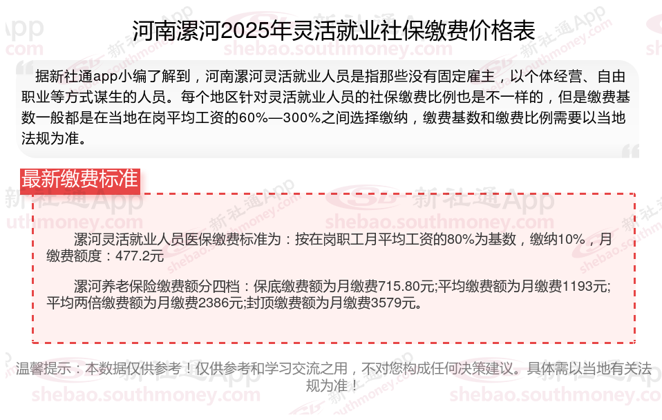 据新社通app数据显示,河南漯河灵活就业养老保险的缴费基数为:3579元。灵活就业人员参保缴费的比例为个人20%。