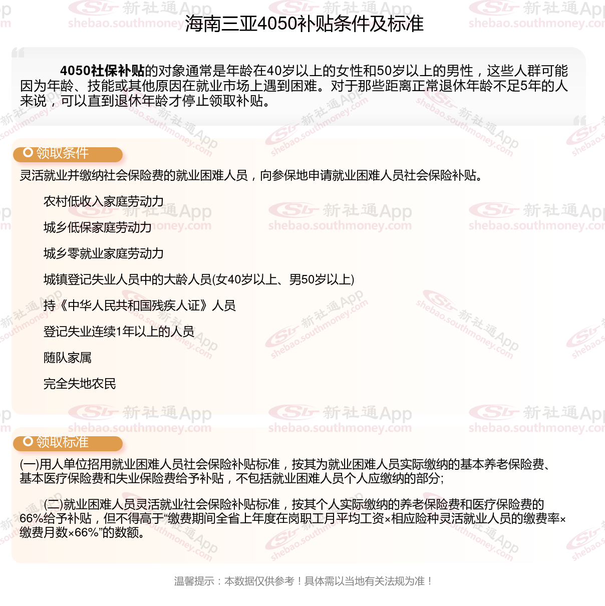 2025海南三亚4050补贴主要针对的是年龄在40岁以上的女性和50岁以上的男性,这些人群通常因为年龄较大而面临就业困难。
