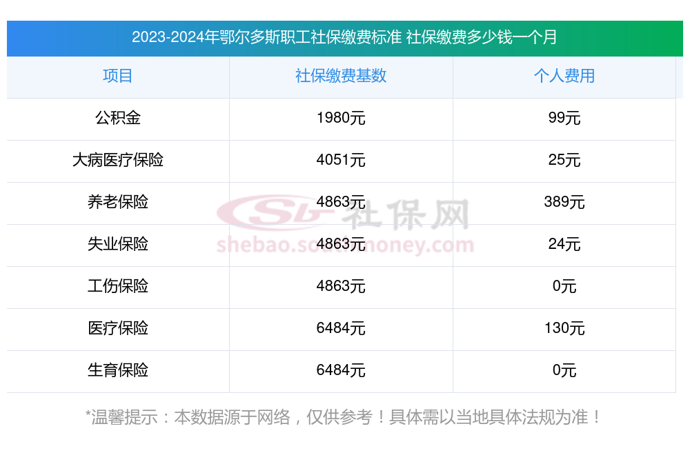 2025年鄂尔多斯社保缴费多少钱?社保要缴够多少年可以退休?下表是2024-2025年鄂尔多斯社保费用明细参考,新社通app-社保缴费查询工具提供的最新数据如下: