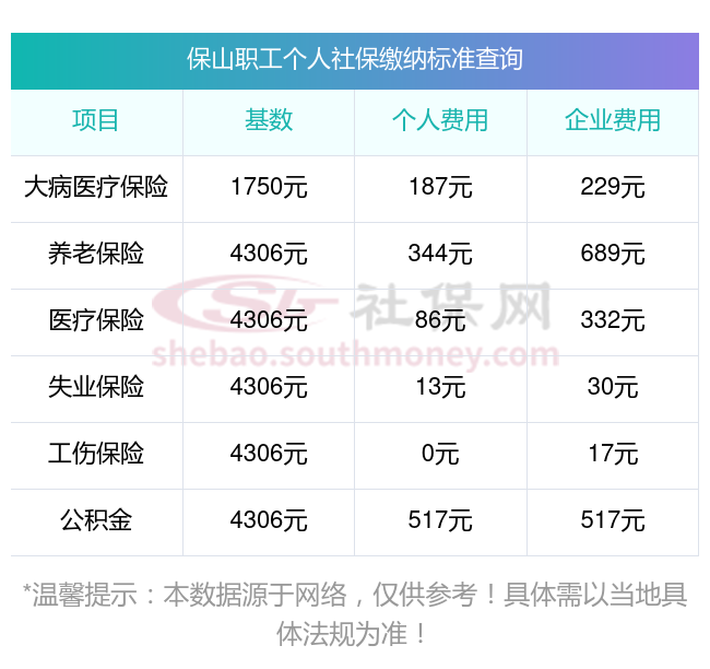 2025年保山社保缴费多少钱?下表是2024-2025年保山社保费用明细参考,新社通app-社保缴费查询工具提供的最新数据如下: