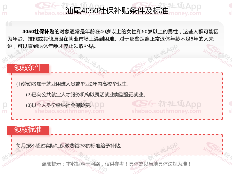 以上就是汕尾4050灵活就业社保补贴的相关内容,欢迎关注新社通/下载新社通APP了解更多五险一金专业资讯。
