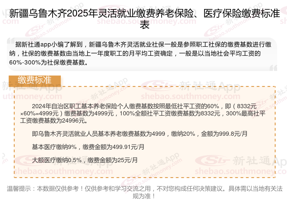 即乌鲁木齐灵活就业人员基本养老缴费基数为4999,缴纳20%,金额为999.8元/月
