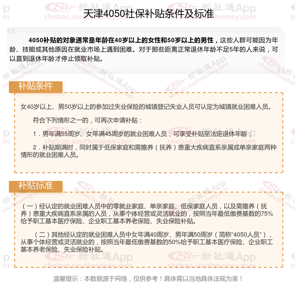 二、2025年天津4050社保补贴标准及条件