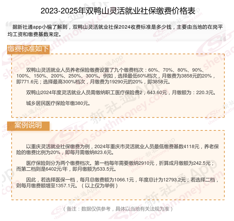 据新社通app数据显示,双鸭山灵活就业养老缴费基数明细如下: