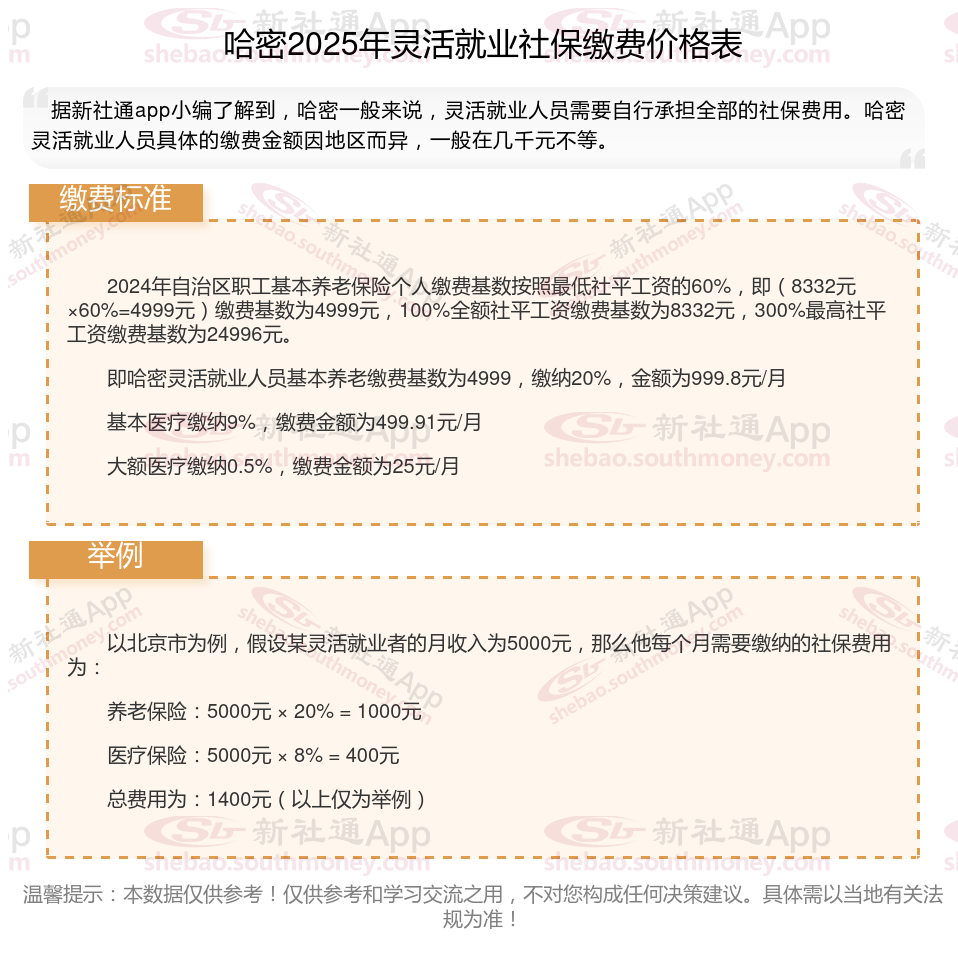 即哈密灵活就业人员基本养老缴费基数为4999,缴纳20%,金额为999.8元/月