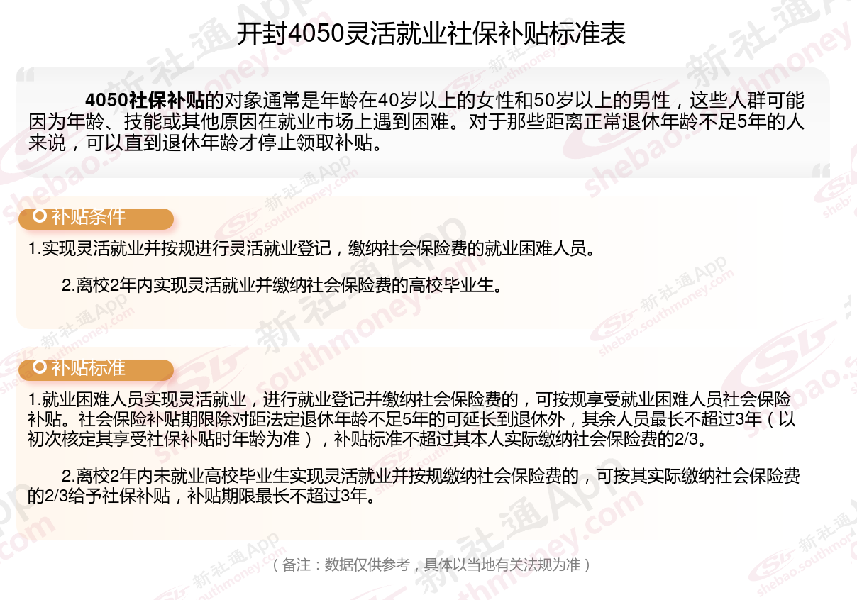 二、2025年开封灵活就业4050社保补贴标准及条件是什么?来了解一下