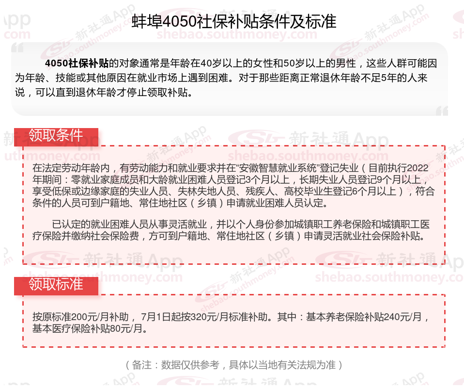 二、2025年蚌埠4050社保补贴标准及条件,最新如下: