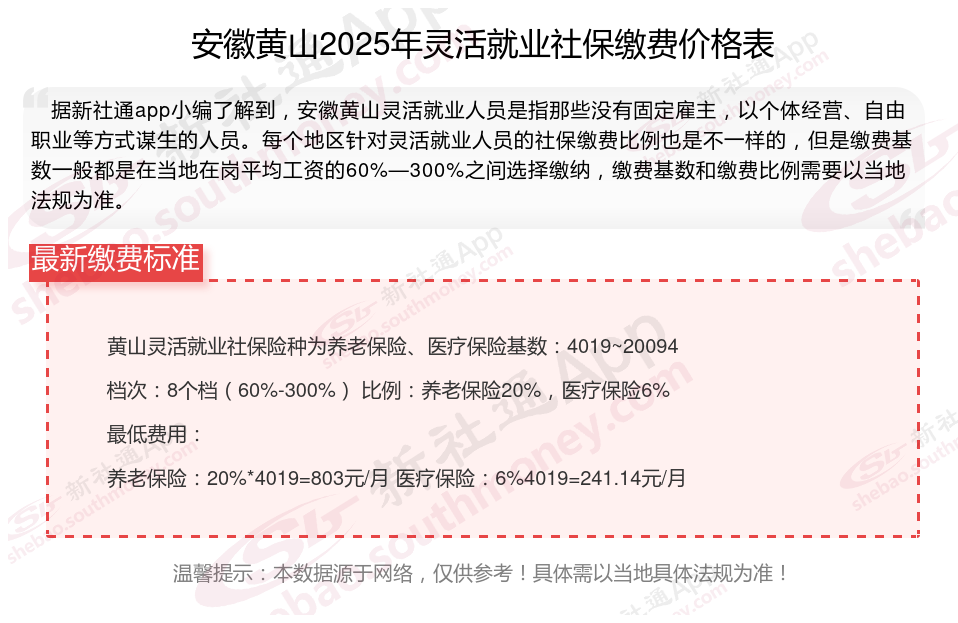 那么,安徽黄山灵活就业人员社保缴费标准2024-2025最新来了,交社保有什么好处?根据新社通app-社保缴费查询工具提供的2025社保缴费标准详情数据: