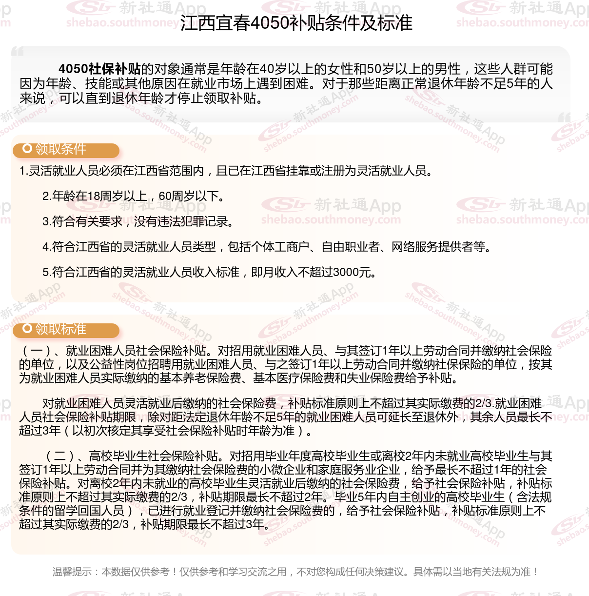 二、2025年江西宜春4050社保补贴标准及条件,最新如下: