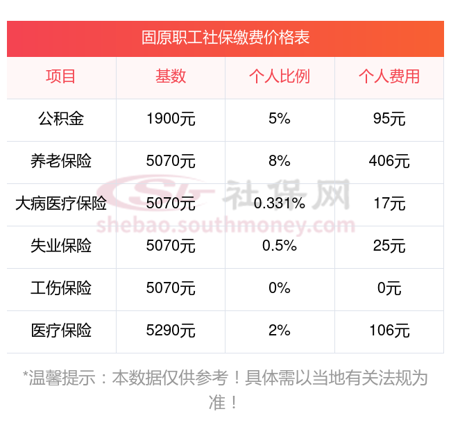2025年固原社保缴费多少钱?下表是2024-2025年固原社保费用明细参考,新社通app-社保缴费查询工具提供的最新数据如下: