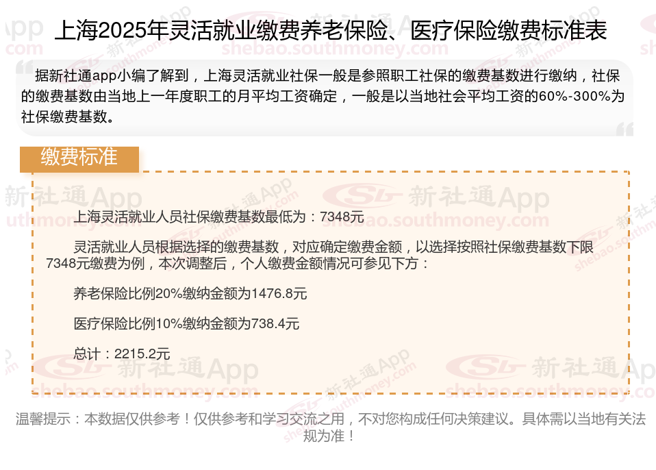 据新社通app数据显示,2024-2025年上海灵活就业人员养老保险的缴费标准是根据缴费基数来确定的: