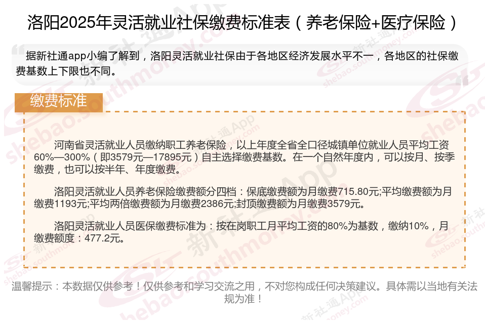 以上就是洛阳灵活就业社保缴费的全部内容,数据及内容供参考!希望对你有帮助,欢迎关注新社通解锁更多社保专业资讯。