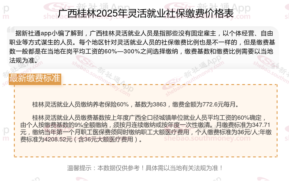 广西桂林灵活就业社保交多少钱一个月?2025社保缴费标准详情,根据新社通app-社保缴费查询工具提供的2025社保缴费标准详情数据如下: