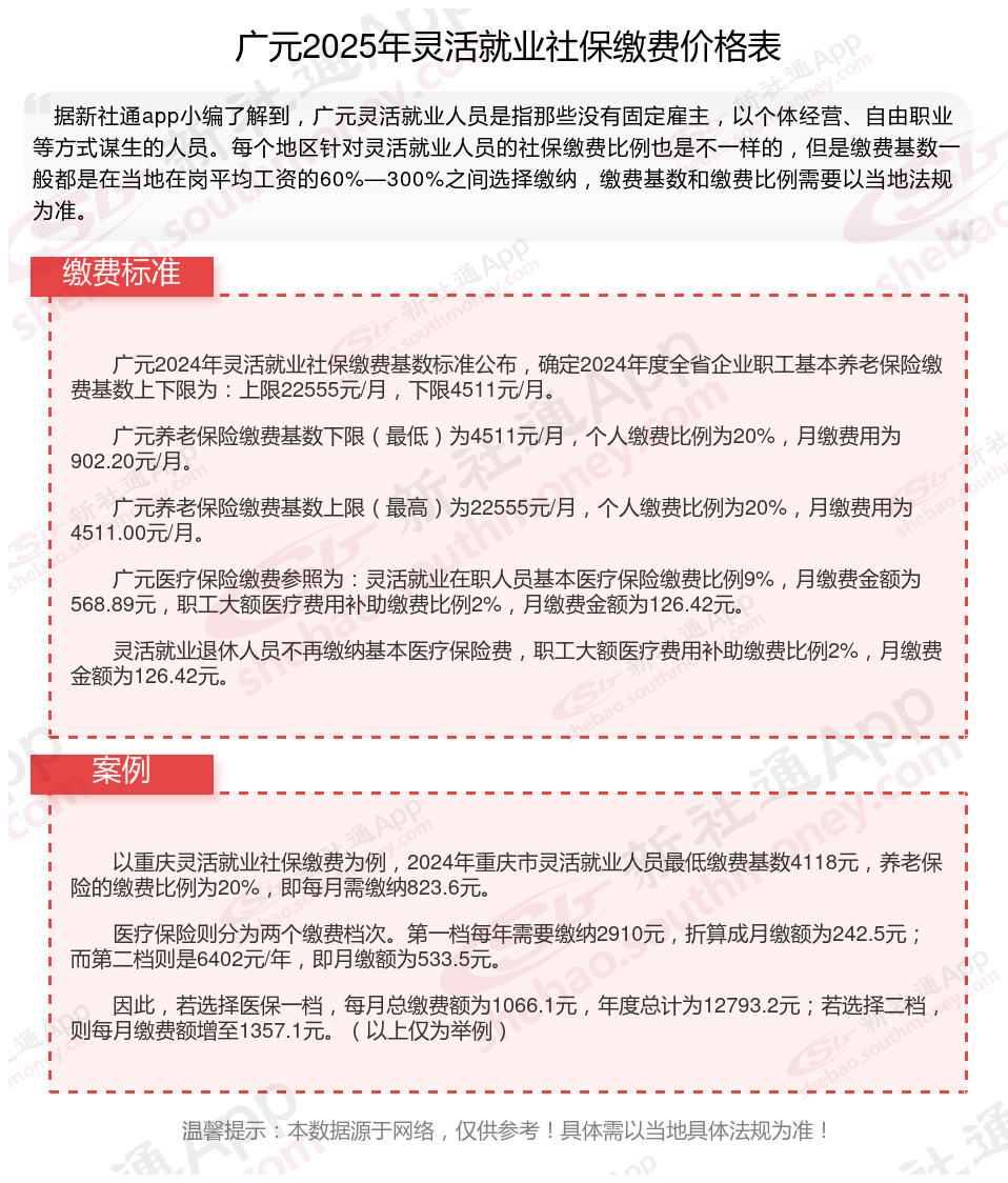 据新社通app数据显示,广元灵活就业人员养老保险缴费基数2024-2025年最新标准如下: