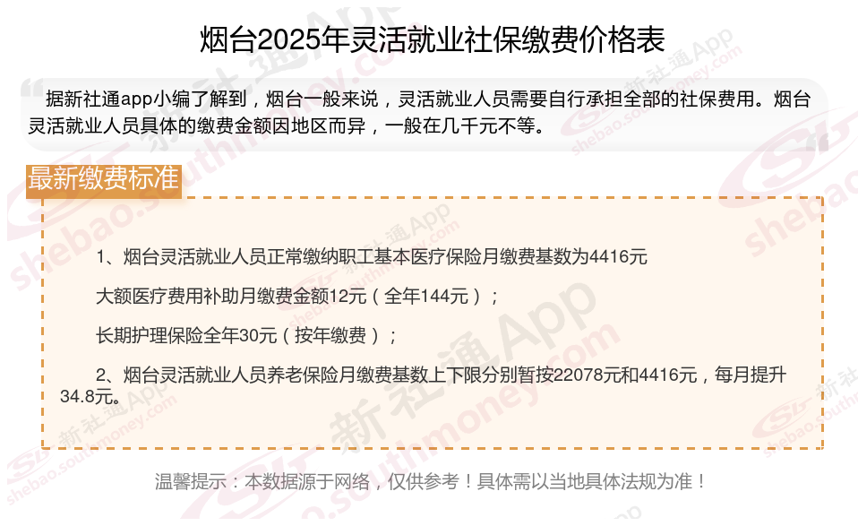 2、烟台灵活就业人员养老保险月缴费基数上下限分别暂按22078元和4416元,每月提升34.8元。