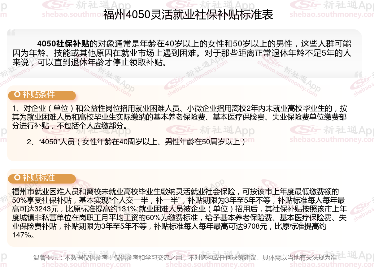 2025福州4050补贴主要针对的是年龄在40岁以上的女性和50岁以上的男性,这些人群通常因为年龄较大而面临就业困难。
