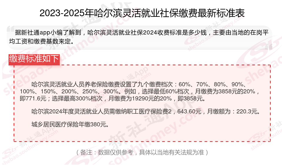 以上就是带来哈尔滨灵活就业社保缴费标准相关知识,内容供参考,希望对你有帮助,欢迎关注/下载新社通APP解锁更多社保专业资讯。