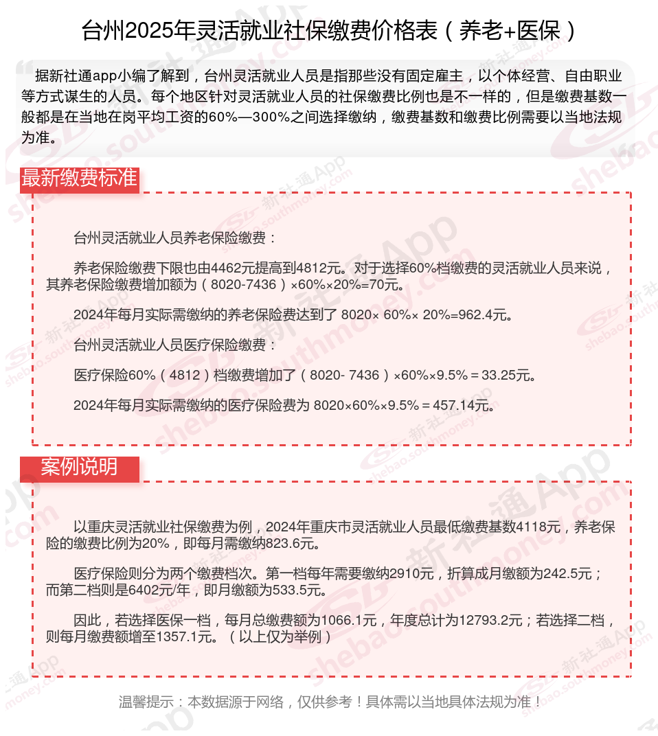 据新社通app数据显示,2024-2025年台州灵活就业人员养老保险的缴费标准: