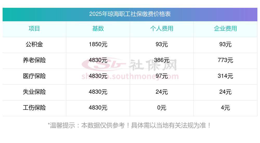 2025年琼海5险缴费标准,2025年琼海社保缴费多少钱?下表是2025年琼海社保费用明细参考,新社通app-社保缴费查询工具提供的最新数据如下: