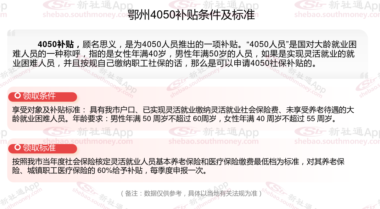 二、2025年鄂州4050社保补贴标准及条件,最新如下: