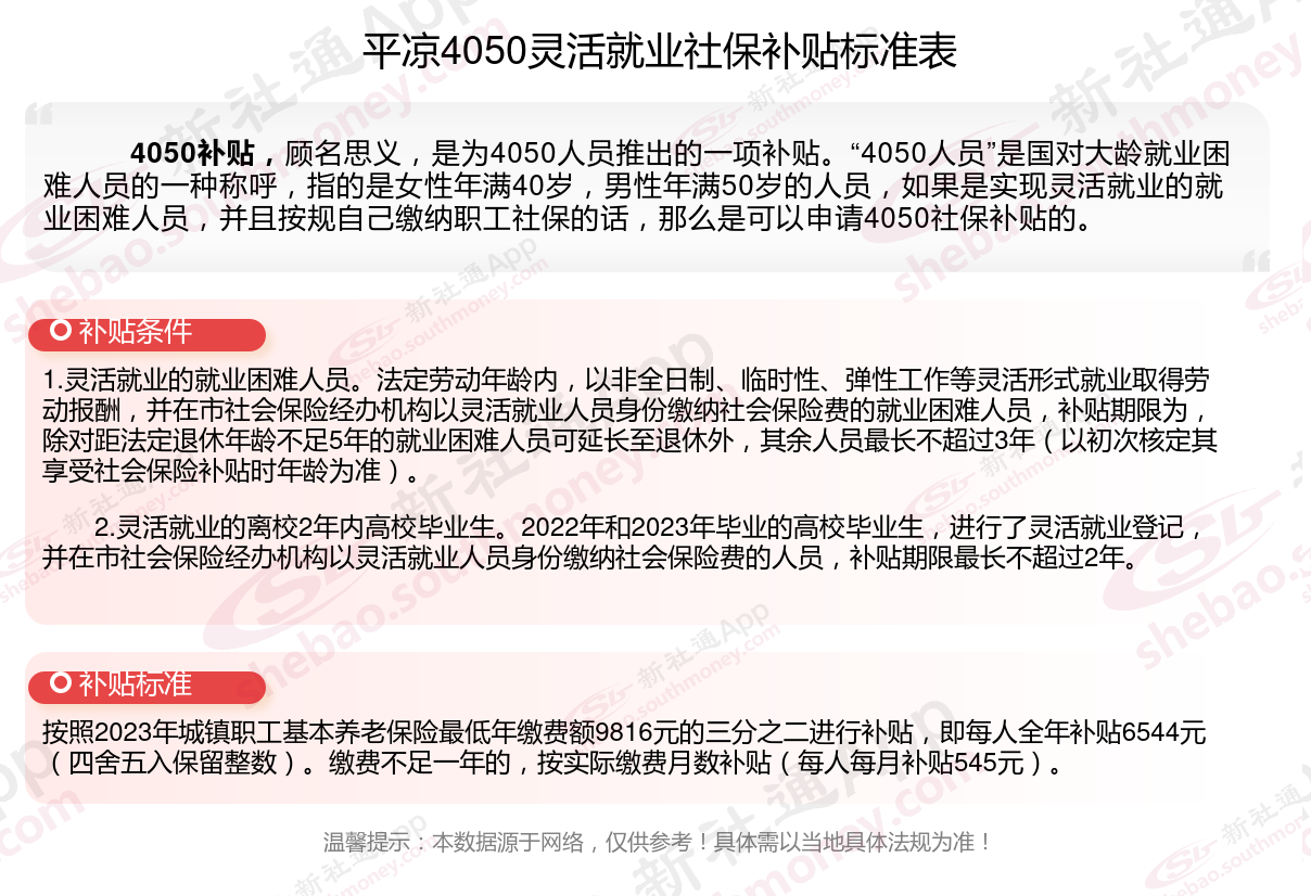 二、2025年平凉4050社保补贴标准及条件,最新如下: