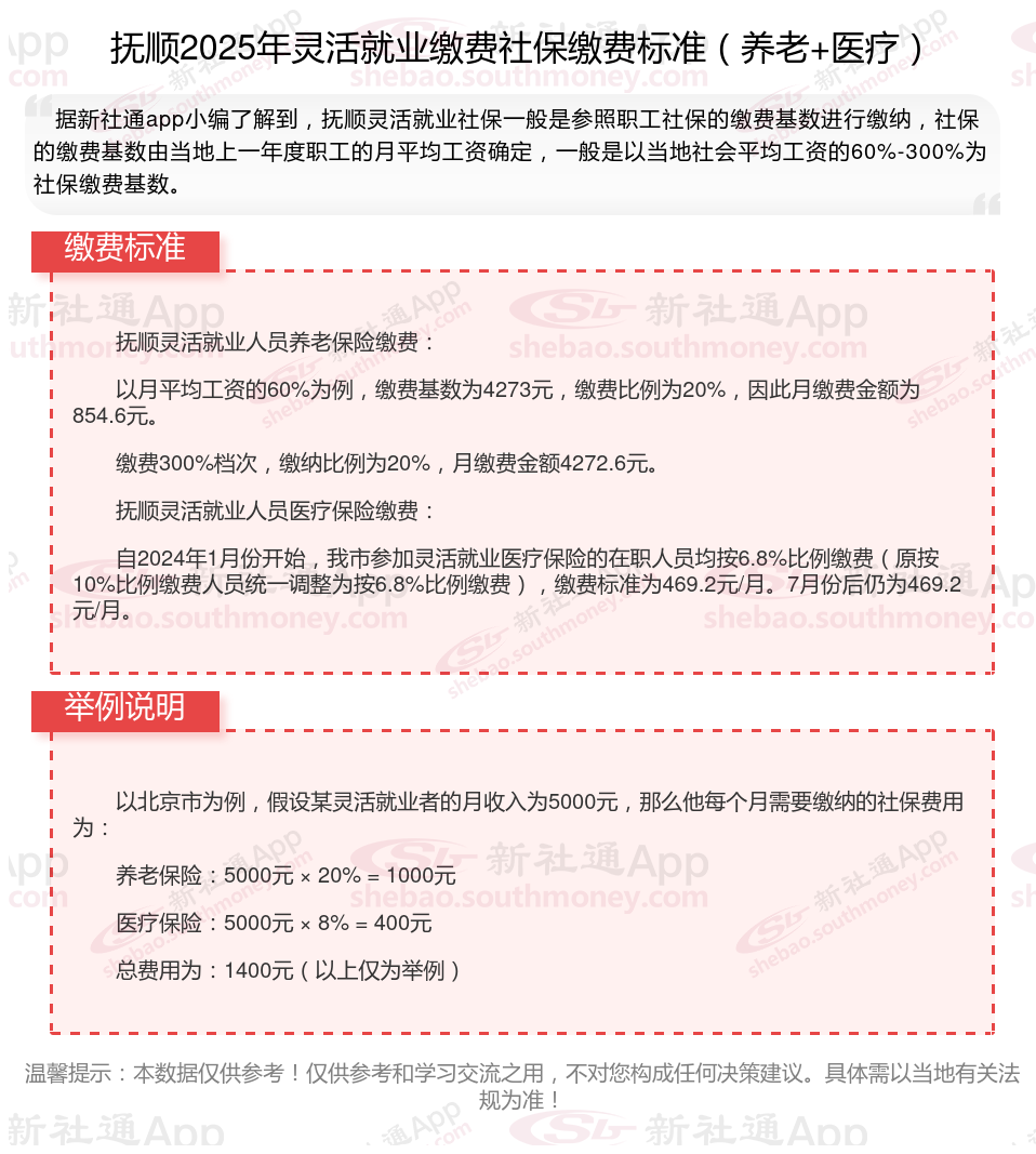 据新社通app数据显示,抚顺企业灵活就业养老保险的缴费基数为:4273元。