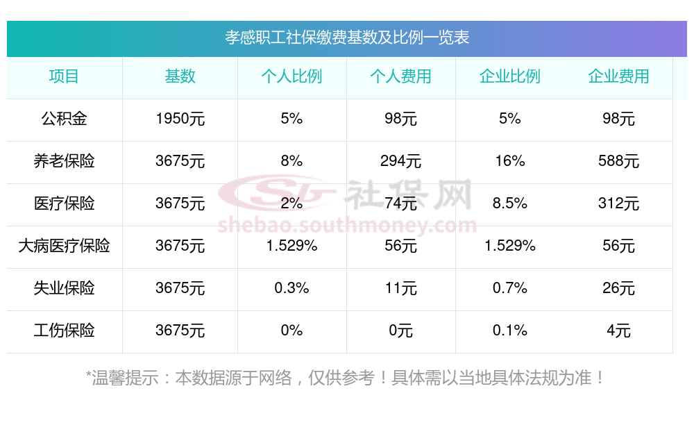 孝感社保缴纳明细如下: